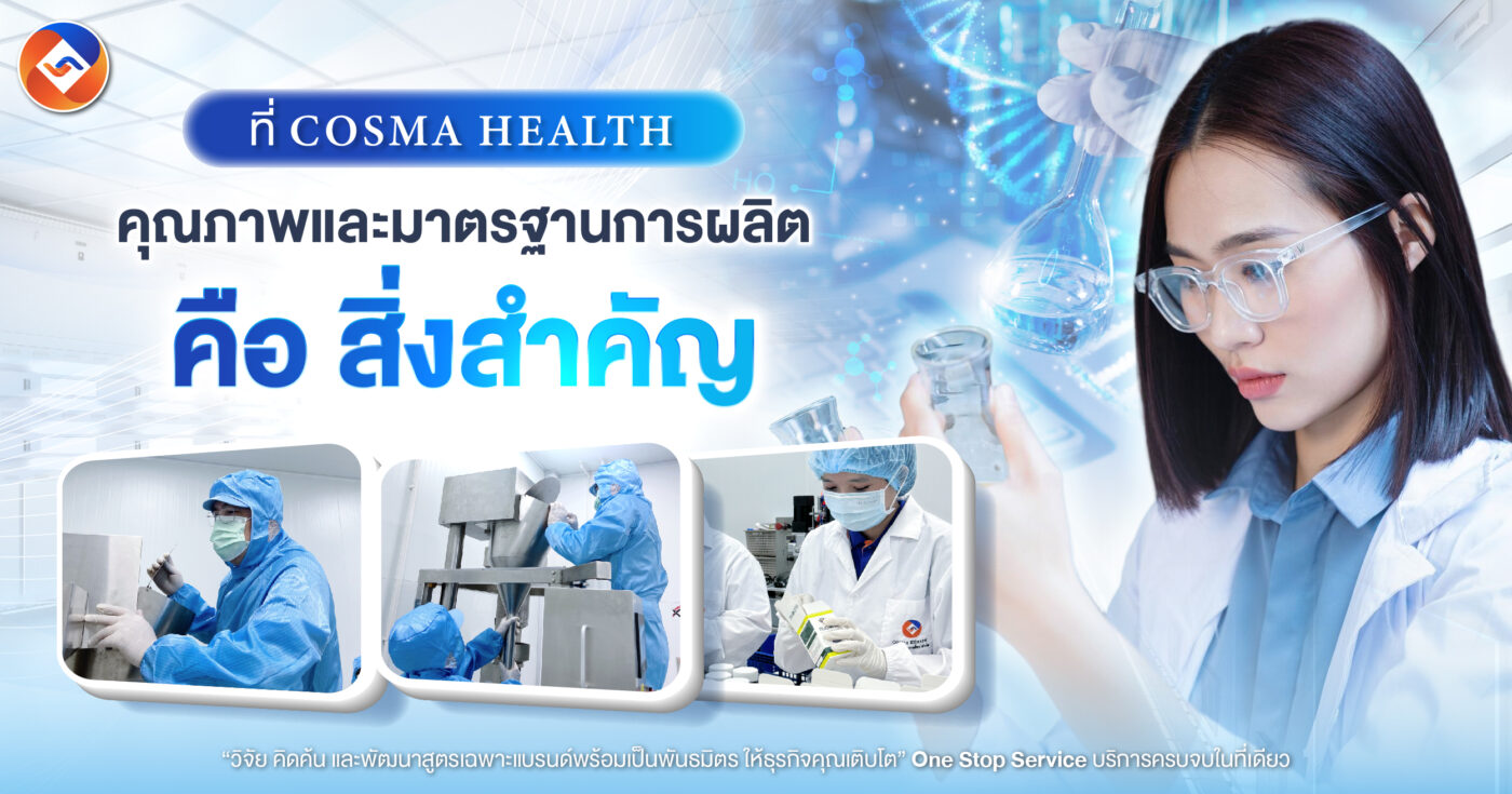 กระบวนการผลิตอาหารเสริมสารสกัดจากถั่งเช่าของ Cosma Health ได้รับการรับรองมาตรฐานการผลิต GMP (Good Manufacturing Practice) และ ISO (International Organization for Standardization) ซึ่งเป็นมาตรฐานระดับสากลในการผลิตอาหารเสริม กระบวนการผลิตทั้งหมดดำเนินการในสภาพแวดล้อมที่สะอาด ปลอดเชื้อ และถูกควบคุมอย่างเข้มงวด เพื่อความปลอดภัยและคุณภาพของผลิตภัณฑ์