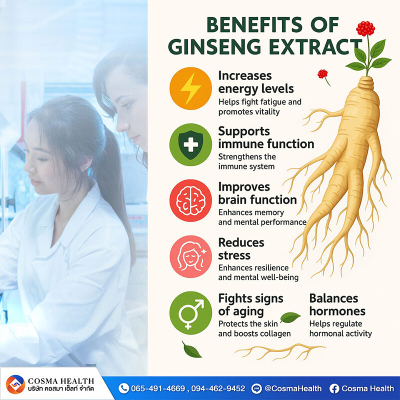 สารสกัดจากโสม มีประโยชน์ต่อสุขภาพในหลายด้าน ไม่ว่าจะเป็นการเพิ่มพลังงาน ลดความเครียด กระตุ้นการฟื้นตัวของกล้ามเนื้อ การเสริมสร้างระบบภูมิคุ้มกัน บำรุงผิวพรรณ และปรับสมดุลฮอร์โมน การเลือกใช้สารสกัดจากโสมในผลิตภัณฑ์อาหารเสริมควรพิจารณาจากชนิดของโสม รูปแบบผลิตภัณฑ์ ปริมาณที่เหมาะสม และข้อควรระวัง เพื่อให้ได้ประโยชน์สูงสุดและหลีกเลี่ยงผลข้างเคียงที่อาจเกิดขึ้นจากการใช้สารสกัดจากโสมแบบผิดวิธี เจ้าของแบรนด์จะต้องให้ความสำคัญกับปัจจัยต่าง ๆ เหล่านี้ เพื่อสร้างแบรนด์อาหารเสริมสารสกัดจากโสมที่น่าเชื่อถือ เห็นผล และดีต่อกลุ่มเป้าหมายในระยะยาว