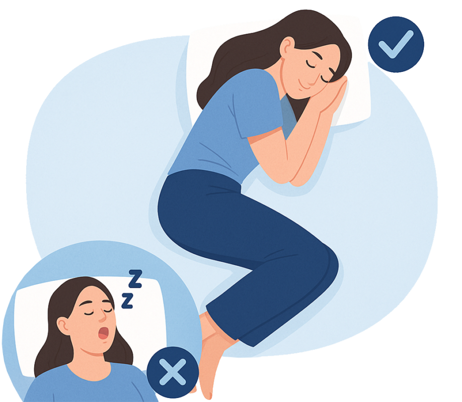 การปรับท่านอนช่วยลดการนอนกรนได้โดยเฉพาะการนอนตะแคง สาเหตุที่การนอนตะแคงช่วยลดการนอนกรน เพราะเมื่อนอนหงายกล้ามเนื้อในช่องลมมีโอกาสหย่อนคล้อยลงมาปิดกั้นทางเดินหายใจได้ง่าย แต่การนอนตะแคงจะช่วยให้ทางเดินหายใจเปิดกว้างขึ้น จึงช่วยลดการกดทับของลิ้นและเพดานอ่อน