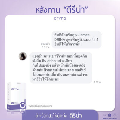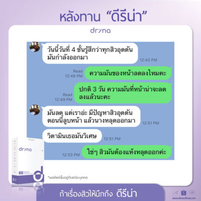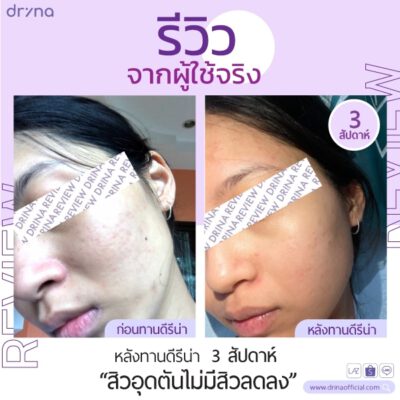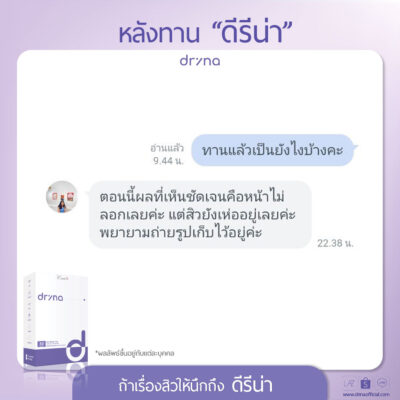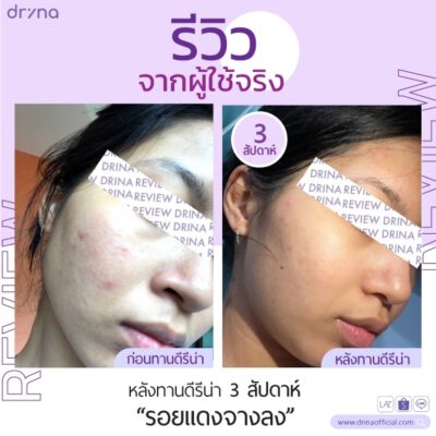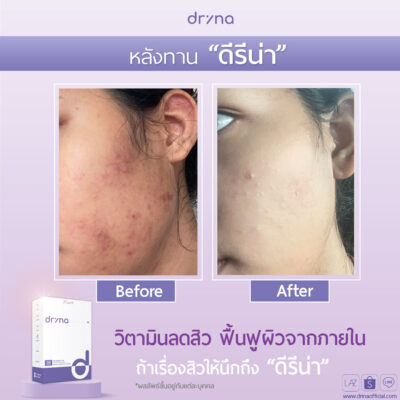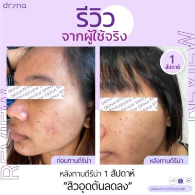 A : รอยสิวต่างๆ ไม่ว่าจะเป็นรอยแดงหรือรอยดำที่เกิดจากสิวจะเริ่มเห็นผลชัดหลังทานดีรีน่า 7 วันขึ้นไปค่ะ